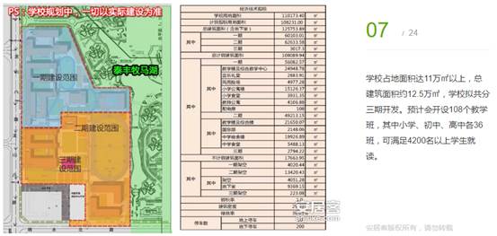 學(xué)校占地面積達(dá)11萬㎡以上,總建筑面積約12.5萬㎡,學(xué)校擬共分三期開發(fā)。預(yù)計會開設(shè)108個教學(xué)班,其中小學(xué)、初中、高中各36班,可滿足4200名以上學(xué)生就讀。