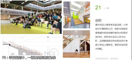 澳大利亞心理專家實驗證明:小學(xué)生對于事物的認(rèn)識、辨別與選擇多是根據(jù)對視覺有強(qiáng)烈感染力的色彩進(jìn)行的。該校多處設(shè)立公共大臺階,運用鮮艷色彩和材質(zhì)出充分考慮小學(xué)生心理特點,激發(fā)學(xué)生的藝術(shù)細(xì)胞。